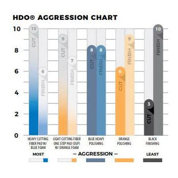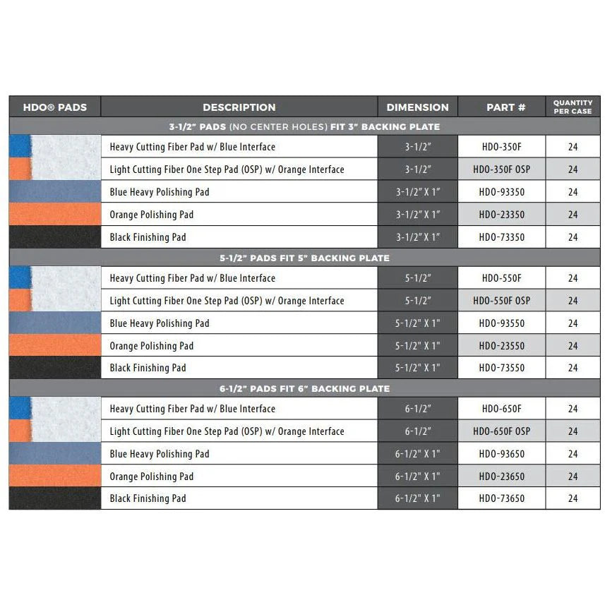 | Stay Cool | HDO pads block heat transfer between layers and offer the same benefits of a thin pad (maximizing the power of the polisher by reducing foam movement or “absorption”). Along with the benefits of a thin pad, the design and shape offer proper weight and weight distribution for maximum performance. |