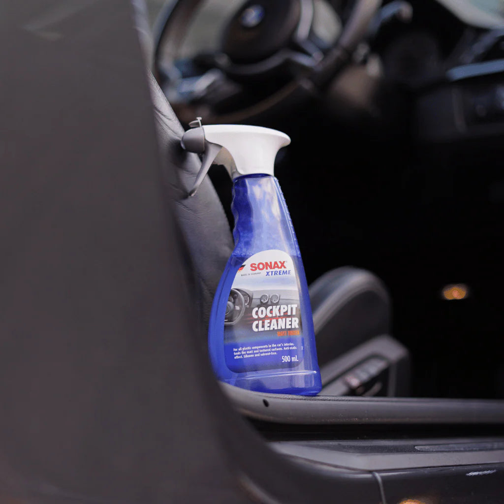 SONAX Cockpit Cleaner. This advanced interior cleaner is specially formulated to clean and protect all plastic, vinyl, and rubber surfaces in your car's cockpit, leaving behind a very matte finish that enhances the natural look of your interior.