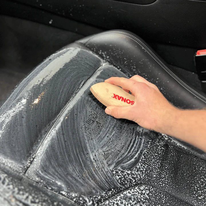 - Apply a small amount of Sonax Leather Care Milk onto the Sonax Leather brush or applicator sponge.